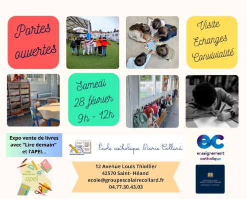 L’école maternelle et élémentaire Marie Collard accueille les enfants dès 2 ans pour les accompagner dans leur scolarité jusqu’au CM2 autour d’un projet éducatif et pastoral fort.